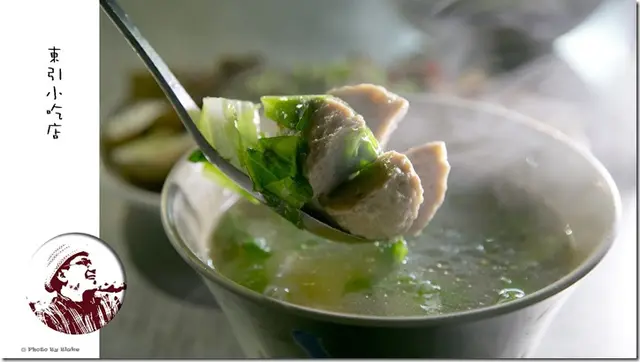 以前點上貢丸湯總是會以湯內有幾顆貢丸,來判斷這家的價格實不實惠,東引小吃店內的蛋包貢丸湯就僅有一顆貢丸,這時你心中是否想著這老闆也太小氣了,但這唯一顆貢丸還真不一樣,比一般的大多了,大到布雷克都要分成四口才能吃完,沒有概念嗎?它的大小就跟常吃到的福州丸還要大一滴滴,咬下去那瞬間,肉汁噴出,口感上彈性十足,完全不是那種會越煮越大顆鬆散的貢丸。