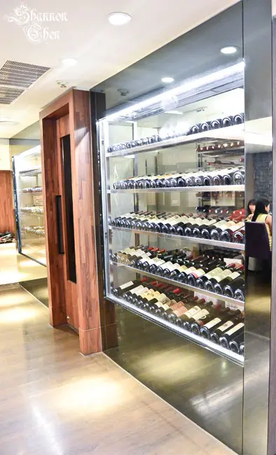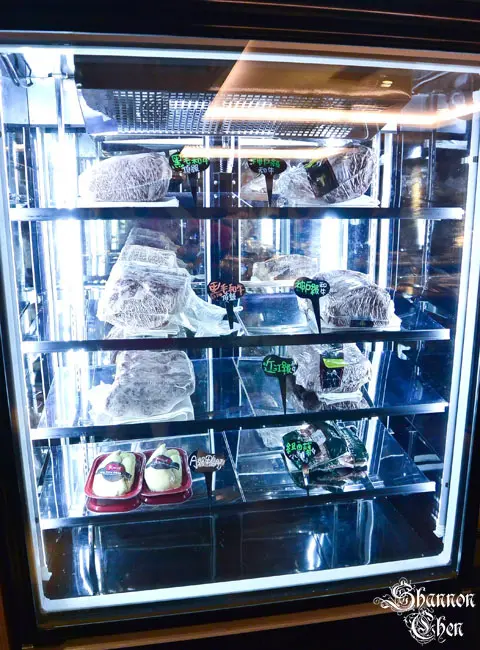 有好幾櫃透明的冰櫃裡頭有許多酒品,另外也有展示肉的冰櫃