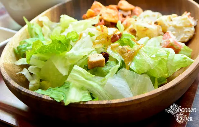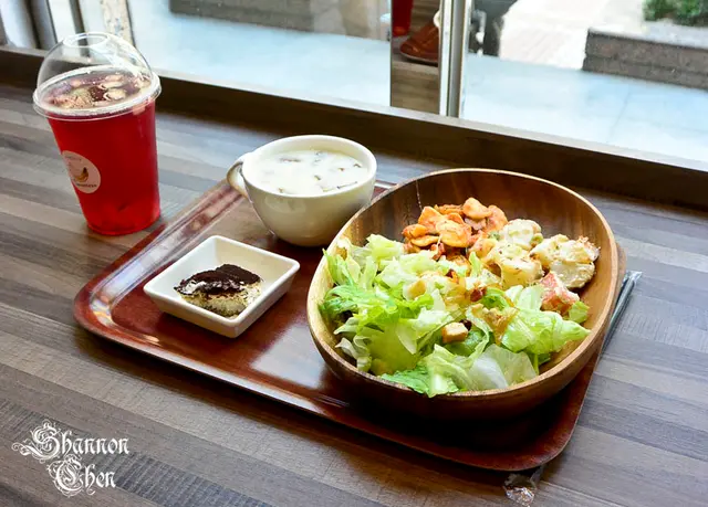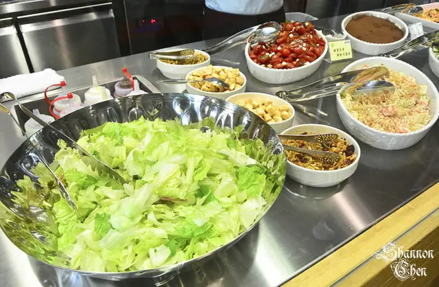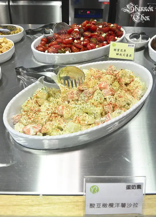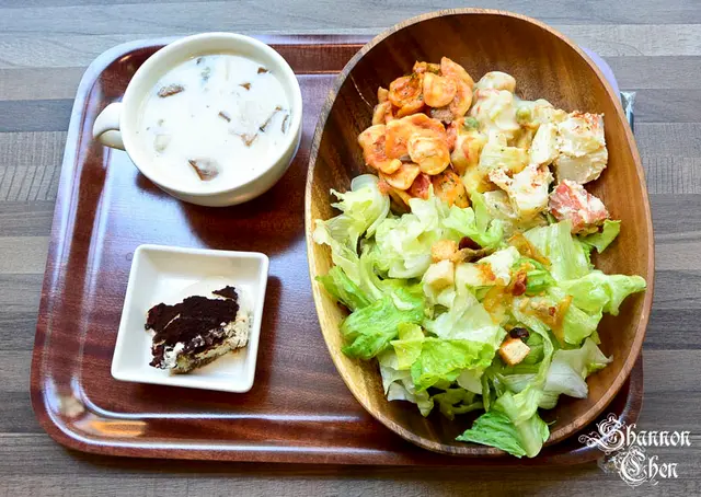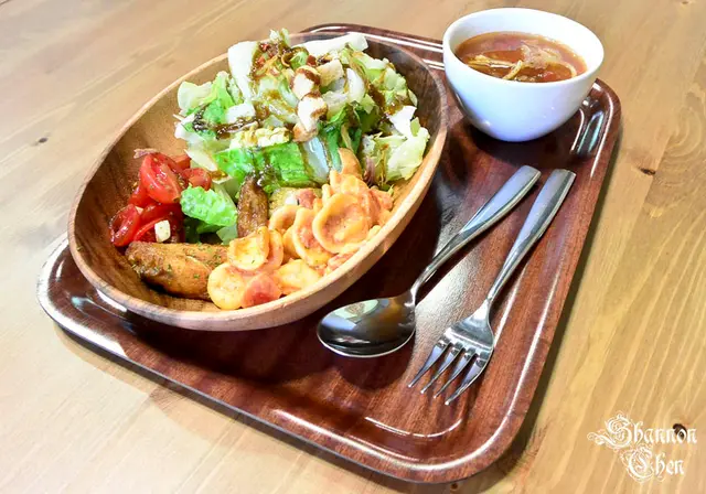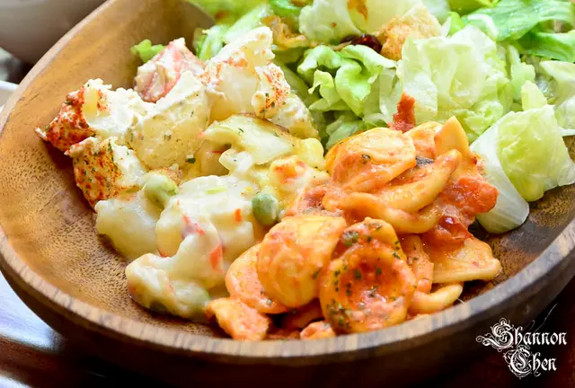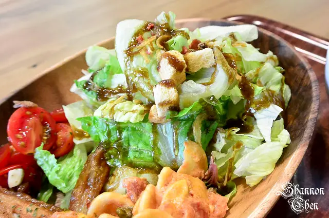 摩典那紅酒油醋、和風絹雨、加州酪梨、GREEN泰風味、蘋果香橙油醋、卡狄尼凱薩),而每日都會有九種不同的配菜可以選擇三種,