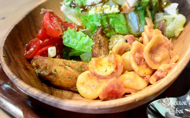 的沙拉了,沒有放到發黃乾澀口感的沙拉吃起來非常雀躍,凱薩醬美味以外,雞翅也蠻嫩的且香味夠,章魚的洋蔥帶點嗆味很過癮,整體非常滿意!