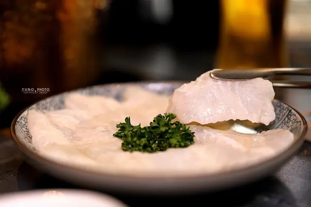 老撈先將鮮嫩透白的多利魚抓拌蛋液 涮燙後口感特別柔軟滑順