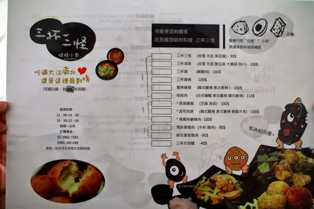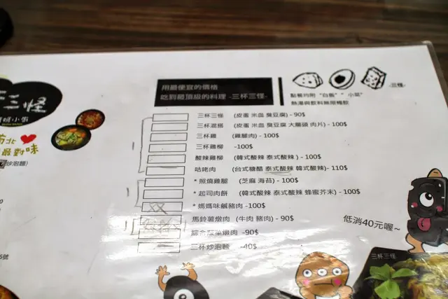 品項數量三杯三怪9選1三杯混搭三杯雞三杯雞柳韓式雞柳泰式雞柳糖醋咕咾肉韓式咕咾肉泰式咕咾肉照燒雞腿3選1起司肉餅媽媽味鹹豬肉====>雙拼馬鈴薯燉肉2選1綜合蔬菜燉肉 ===>燉肉雙拼炒泡麵(可選口味不含照燒雞腿、起司肉餅、媽媽味鹹豬肉)任選1份附白飯、飲料、湯品無限供應