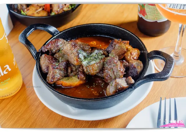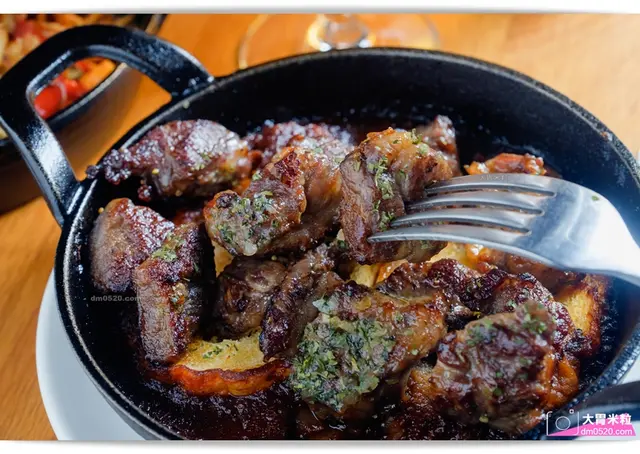 牛肋條堆成一座小山,上面放上一塊大蒜奶油,油油亮亮看起來好誘人!