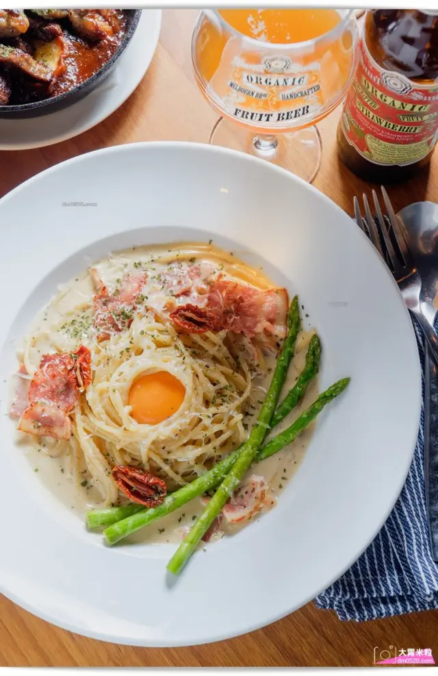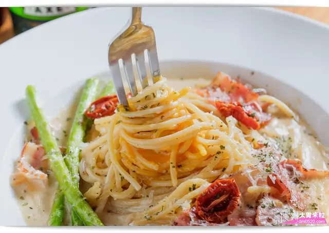 一上桌就被深深吸引,濃郁的白醬包覆著麵條,搭配自製番茄乾和培根的鹹香,超好吃!