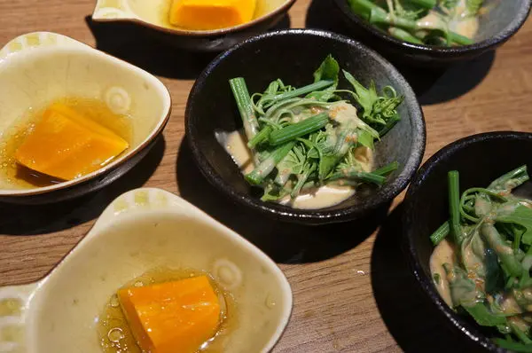 這天店家提供的小菜是柚子醋南瓜及胡麻龍鬚菜,店家自製調配的醬料很特別,搭在一起很好吃喔!小菜也會不定期的變化喔