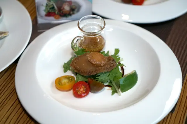 三兩重本土大型九孔鮑,以日式醬燒手法滷上四小時,佐以日本水芹菜與夏日啤酒製成的晶凍並淋上主廚特調和風柚子醋