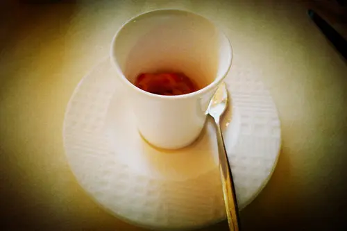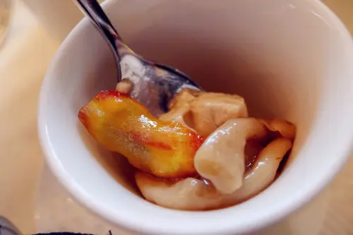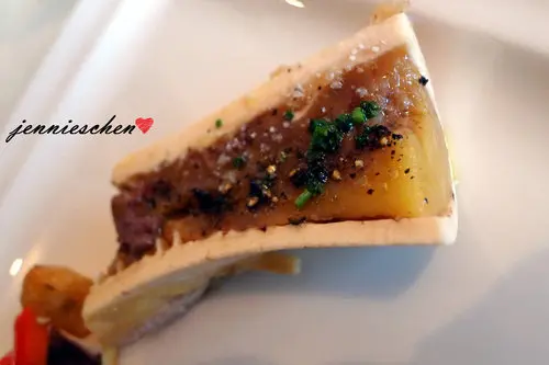 猜的出這是什麼嗎?吃起來入口即化,是牛油嗎?有一種牛腥味道,很像我小時候吃到肥豬肉的那個口感,我超怕那個味道,我記得爸爸都強迫我們一定要吃那個肥肉,我總是留在最後,要準備離開餐桌時再把那一口肥肉吃到嘴巴裡含到廁所去吐掉,現在才知道肥豬肉有豐富的膠原蛋白呀!