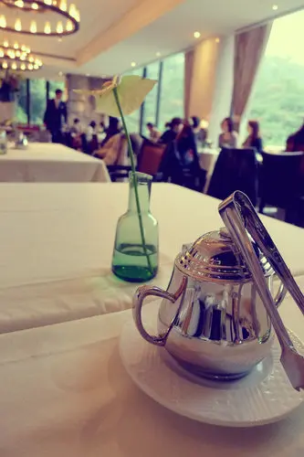 而典雅的歐式吊燈彷彿踏入了十八世紀仿歐洲的復古風情,餐廳旁有著大片的落地窗遠眺丹鳳山,好似沉浸在山林裡,自然美景盡收眼底