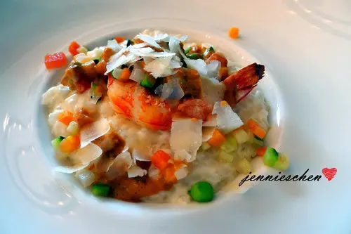 我點的燉飯,煮熟的米飯灑上一層起司,香滑的口感帶著海鮮的甜味與酒香,全部的味道整個鑽進米飯裡,濃稠的口感味道相當濃郁,微微的清酒甘甜真是太好吃了!