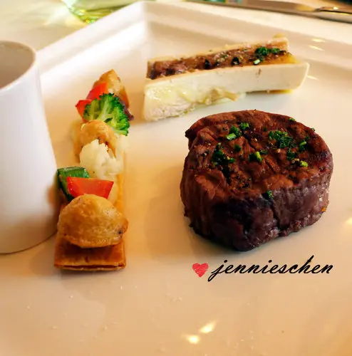 跳脫一般制式化的擺盤,印象裡牛排的擺盤總少不了馬鈴署泥及青花菜、四季豆、玉米筍....,但是這樣的擺盤卻是別出心裁,有種可愛有趣的氛圍。視覺上也大大加分。