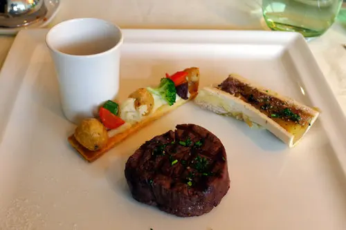 我們這次是使用麗禧去年在國際旅展所優惠的票券,歐陸餐廳680元的輕食套餐二人份或是一人份1380元的套餐。輕食套餐內容有開胃小品、香料油封鮪魚佐初榨橄欖油蕃茄醬汁或南法時錦貝類蔬菜湯、法式傳統白汁燴犢牛附義大利麵(牛肉產地:澳洲)或炭烤明蝦佐乳酪燉飯、主廚手工甜點或咖啡或茶。