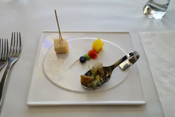 旁邊銀色湯匙裡綠色的是蠔葉 等級 & 價格都比生蠔來的更高 整個一起吃相當滑順 較可惜的是蠔葉的氣味反而不是很突顯
