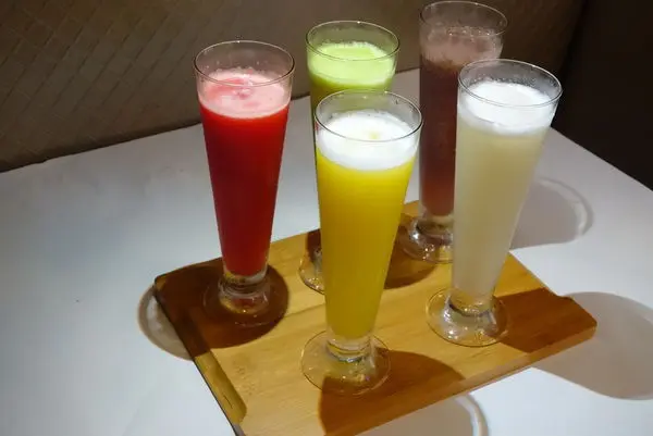 五彩繽紛的蔬果汁擺在一起畫面非常鮮豔