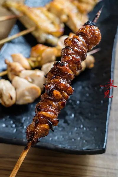 三日雞皮,一串70大洋。這種雞皮的做法是日本鳥丈獨有的,在日本也是高人氣菜色,採用飼養期較長的御鳯雞皮製成,為什麼叫三日雞皮?就是因為它需要先取下雞皮處理乾淨後再層層卷起,不沾醬直接生烤後,浸入特製醬汁再冷藏一晚,隔天再取出烤去多餘油脂,再浸過醬汁後冷藏一夜,待客人點餐後才炭烤上菜!所以它呈現黝黑的咖啡色,吃起來油潤不膩,其實非常不像烤雞皮,反而有點像烤大腸的口感,卻不會咬不爛,愛吃雞皮的人絕對不可錯過!