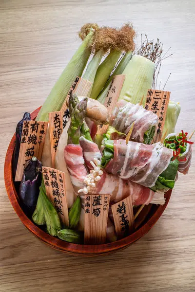 每天會有不同的限定蔬菜及創意串燒供客人選擇,會裝在木盆子裡,端到客人桌前讓客人選。