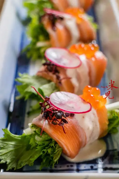 米滋娜鮭魚捲,280大洋。用挪威鮭魚腹薄片卷上日本水菜之後,再淋上帶著檸檬香氣的沙拉醬,最後搭配鮭魚卵、櫻桃蘿蔔薄片和略帶辛辣的紅蓼,吃起來非常爽口,賣相也很誘人,特別受到女性喜愛!