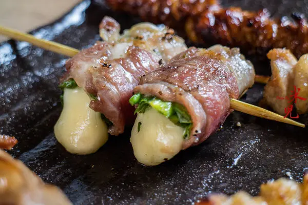 雞肉丸系列,一串70大洋。雞肉丸是日本串燒餐廳中最具代表性的菜色,雞肉丸做得好不好,可以顯示出店家的料理功力。鳥丈的雞肉丸採用御鳯雞柳混合軟骨、雞皮增加滑口度及脆度,完全不加漿粉,以冷藏的方式定形再用炭火直燒,所以能呈現表皮焦香,內裡多汁不乾柴的口感。除了常見沾蛋黃吃的「月見雞肉丸」之外,還有多種創意口味,米兒這次選了搭配青紫蘇葉絲與紫蘇莓醬的「紫蘇梅雞肉丸」,以及搭配韓式辣醬的「韓式雞肉丸」,。下次如果人多一點,還想試試其他口味 !