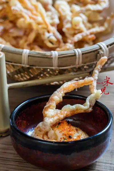 函館魷魚絲天婦羅,150大洋。把函館盛產的魷魚絲放入調了蛋黃的日本進口酥炸粉漿中再去酥炸而成,看起來不怎麼起眼,但是皮酥卻有嚼勁的魷魚絲天婦羅,沾上日本鹹味美奶滋與七味粉混成的沾醬後,吃起來非常ㄙㄨㄚˋ嘴,拿來當零嘴或下酒都很棒!