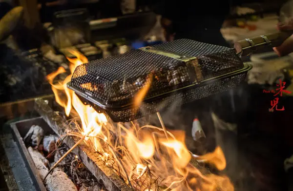 時段限定的稻草燒系列,是在炭火上引燃稻草,利用稻草燃燒的火來燻烤食材。裝在鐵網籠裡的是醃過並且事先以備長炭烤過的半熟雞腿肉,經過這樣的燻烤後香氣更足!!