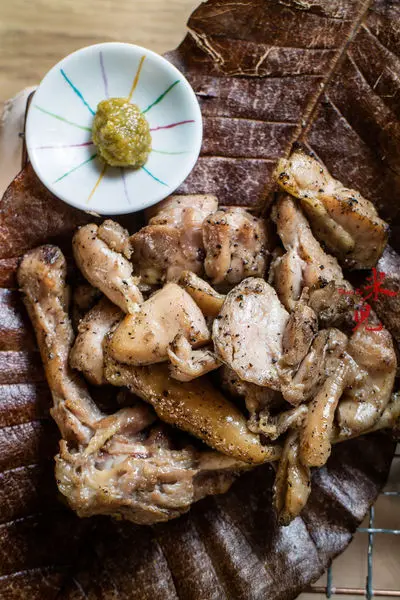 稻草燒雞腿,380大洋一分。經過稻草燒烤後的雞腿,烤好後就是這樣盛盤,美味百分百的稻草燒雞腿,鹹香軟嫩,直接吃就很美味,沾上柚子胡椒更加惹味!如果想要免費品嘗,別忘了週五、週六晚餐8點30分有「我是猜拳王」活動,猜贏的人可以免費享用喔!~