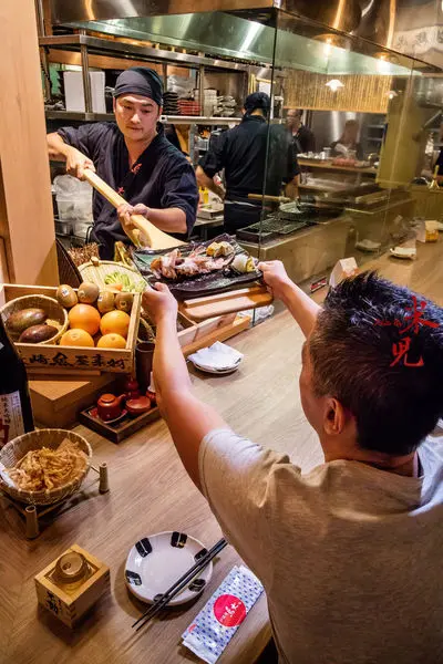 應該很多人知道所謂的「爐端燒」指的是在開放式的炭火燒烤爐燒烤完食物之後,由師傅將料理以船槳送到客人面前的一種居酒屋型態,多半用於規模較小的居酒屋。最初源自於日本宮城縣仙台市的爐端燒,最後在北海道釧路發揚光大,成為受到許多饕客喜愛的獨特燒烤居酒屋。不過,因為船槳送菜的距離十分受限,所以在鳥丈爐端燒餐廳裡,只保留了爐端燒「以炭火燒烤」的料理精神,船槳送菜部分,只限於將烤魚之類的料理直接遞給坐在吧台的客人。雖然不是每個人都能享受到船槳送菜的服務,但是坐在桌席區仍能清楚看到開放式廚房裡,師傅們忙碌準備食材、認真地以備長炭燒烤食材的模樣,也是一種視覺享受!而喜歡私密性的客人,也可以選擇包廂(最少六人才能訂包廂,低消6000大洋)。