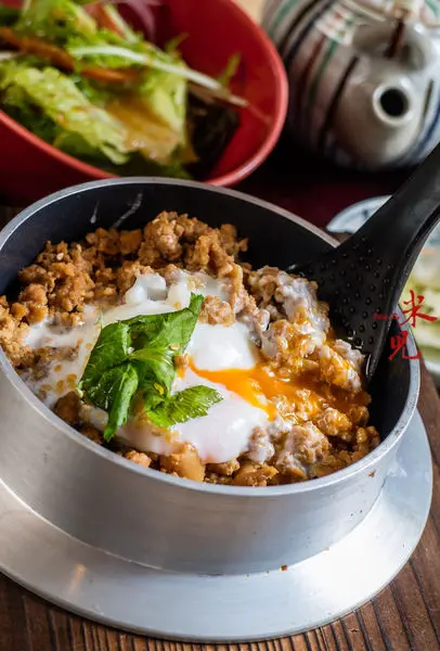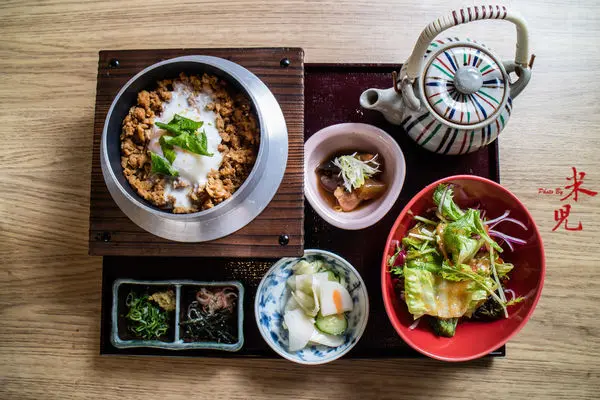 鳥丈雞肉溫泉蛋釜飯套餐,午間250大洋。含沙拉、醬菜、湯、釜飯,這個釜飯可以單點,但午間套餐相較之下非常划算!這個人氣商品是親子丼的變化形,將用自製醬汁炒過的雞絞肉搭配溫泉蛋,底下則是加了牛蒡絲、蒟蒻、紅蘿蔔及從日本自製輸送來台的濃郁柴魚高湯的日本米燜煮而成的釜飯,吃的時候把它拌均了吃非常過癮。除了直接吃之外,也可以倒入茶壺中的高湯,以茶泡飯的方式享用,又是另外一番風味。