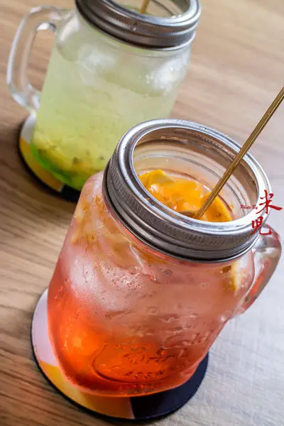 各式各樣色彩繽紛的沙瓦調酒約莫都是140大洋,或是無酒精的鮮果調飲也是鳥丈的一大賣點,都是投女性顧客喜好的呈現方式。前面這杯是柳橙黑醋栗,後面那杯是奇異果,都屬於果香十足的飲品。