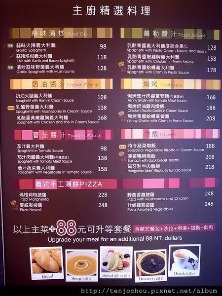加價$88即可升級成套餐,內含:麵包、湯品、沙拉、甜點、飲料