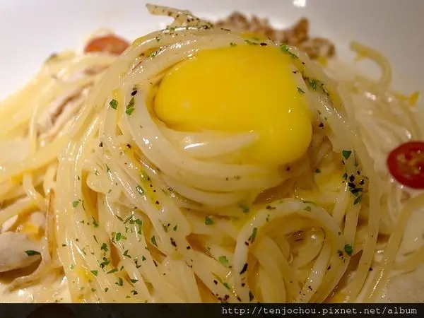 有別於以往白醬義大利麵,加入蛋黃後增添不同香氣