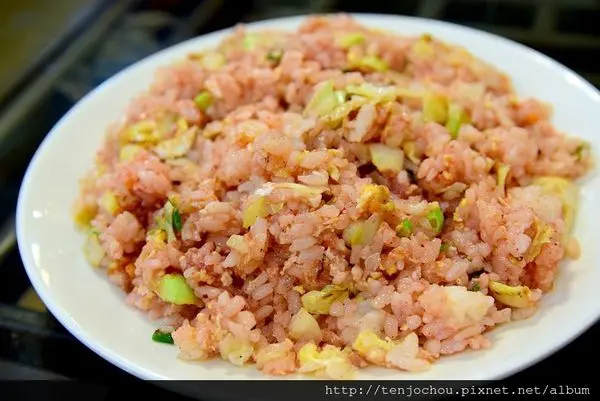 紅色基底的紅麴米飯,加入青蔥等食材快炒,顏色豐富看起來很可口