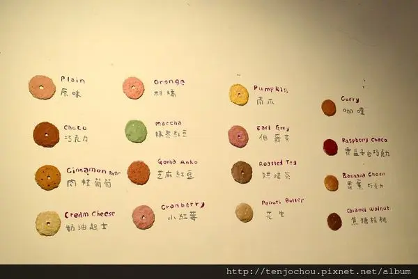 原味、肉桂葡萄、小紅莓、芝麻紅豆、奶油起士、巧克力