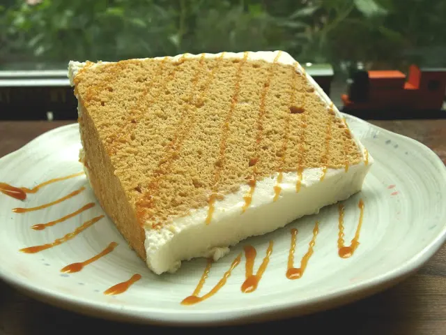 焦糖戚風蛋糕,鬆軟細緻的蛋糕體,在嘴裡伴隨著焦糖香氣一起化開,濕潤而不乾澀,雖甜但不膩反讓人意猶未盡。