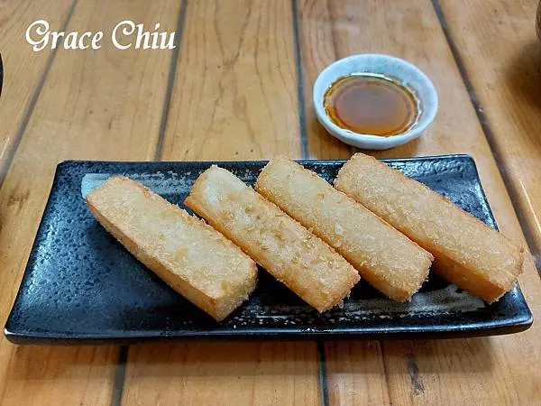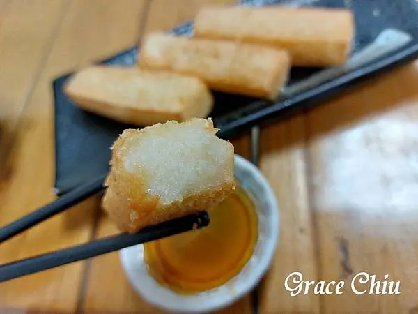 糍粑經蒸熟再沾上麵包粉去炸,外酥內Q,咬起來有Q勁不黏口,口感近似麻糬,沾上糖漿食用香香甜甜不膩口.