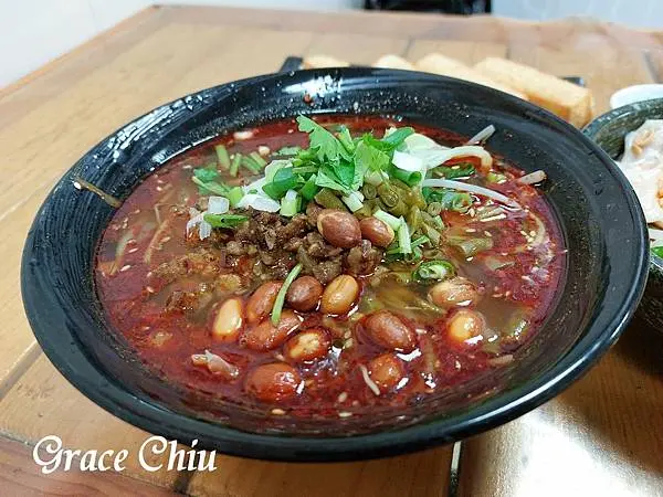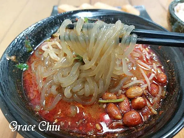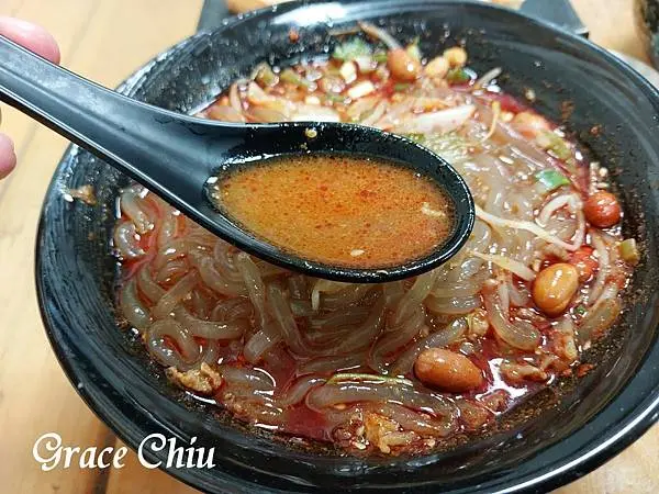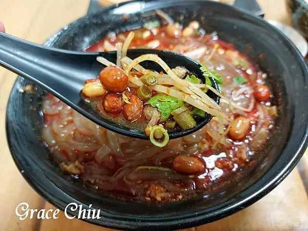 配料有青菜.酸豆.銀芽.肉末.花生,灑上芝麻.香菜及蔥花,當次吃到的紅薯粉條略為偏軟口感滑溜,酸酸辣辣的湯頭入口後能明顯感受到辣度但餘韻不會太過強烈,是溫醇順口的辣.