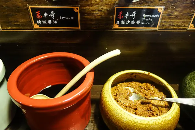 其中主打的就是)赤牛哥汕頭火鍋店家自製的沙茶醬