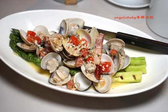 白酒奶油蒸海蛤蠣、嫩煎美國大蘆筍