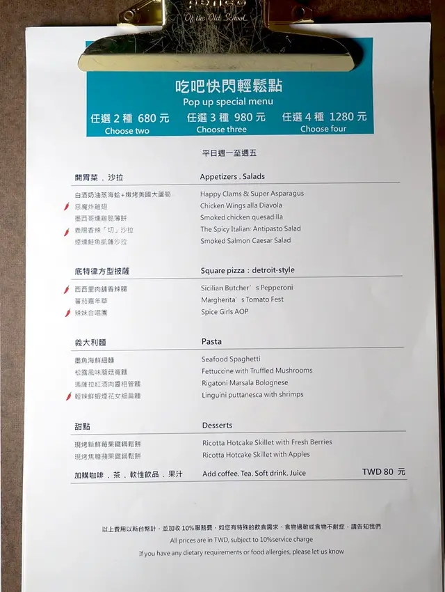 開胃菜、底特律比薩、義大利麵、甜點(這四款當中選四樣)