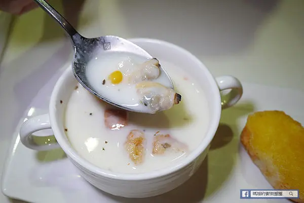 玉米蛤蜊濃湯是套餐中的例湯,凡單點任何主餐可加169元組合成套餐,就可增加每日例湯、法式手工烘培麵包、飲品和甜點。