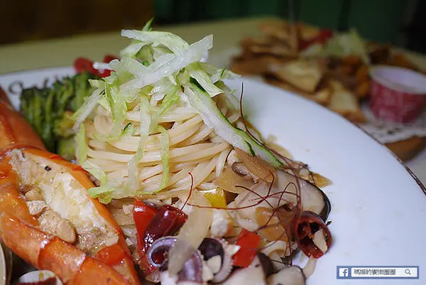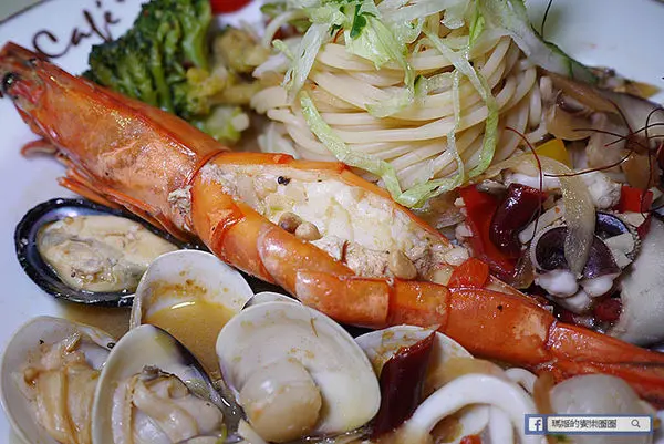 海大蝦佐松露義大利麵360元,這道義大利麵豐富的海味是推薦必點的,裡面有一整尾的海大蝦就擺在最醒目的位置。