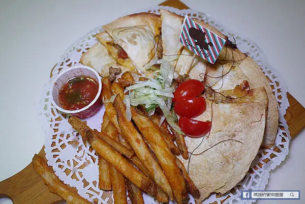 美式辣蝦墨西哥烤餅240元,一整份裡有附帶皮黃金脆薯佐莎莎醬,這樣的份量感覺也可以當主餐了。