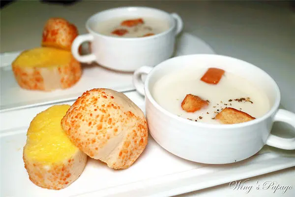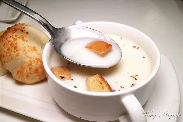 湯品為奶油玉米蛤蜊濃湯,有獨特奶香氣味,加上蛤蜊及玉米粒提味,喝來清爽順口。