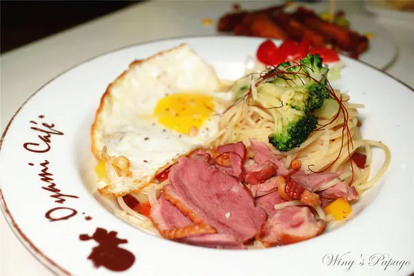 簡單以蒜粒、甜椒清炒的櫻桃鴨胸義大利麵舖上大量煙燻鴨胸肉片,