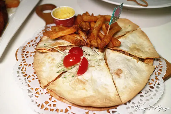 8吋雙人份烤餅份量好充足,感覺都可以當做主餐了! 附上黃金脆薯及起司沾醬。