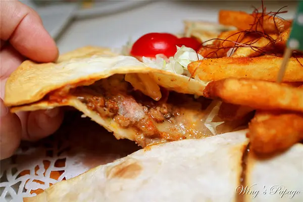 烤餅內包肉末、泡菜、起司等配料,結合了各種食材的香味,