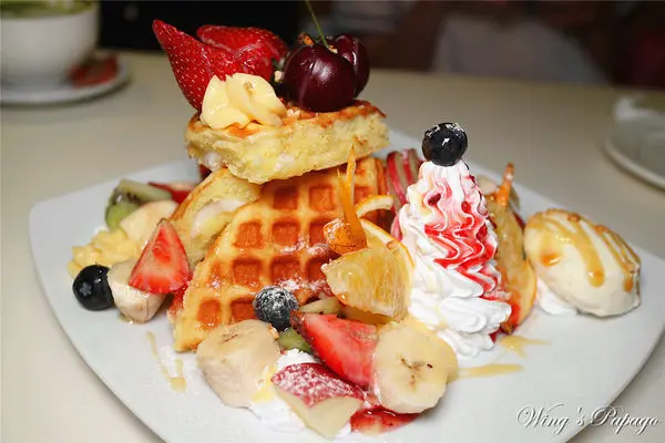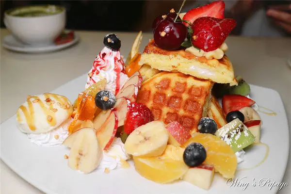 鬆餅賣相超級誘惑人的啦!鬆餅搭配草莓、奇異果、蘋果、香蕉、藍莓等多種季節水果,