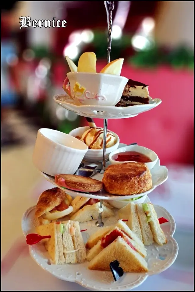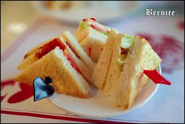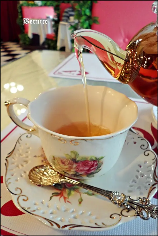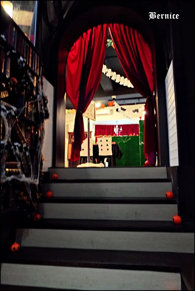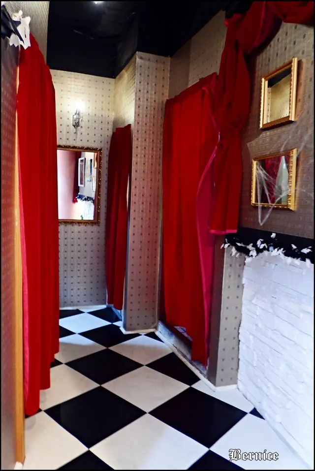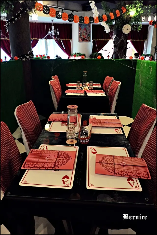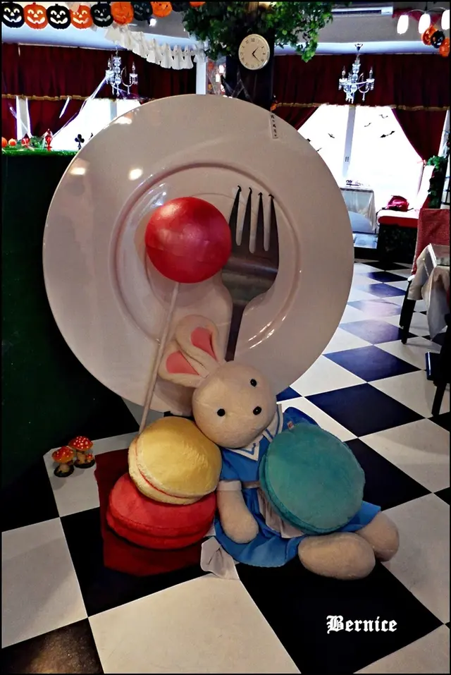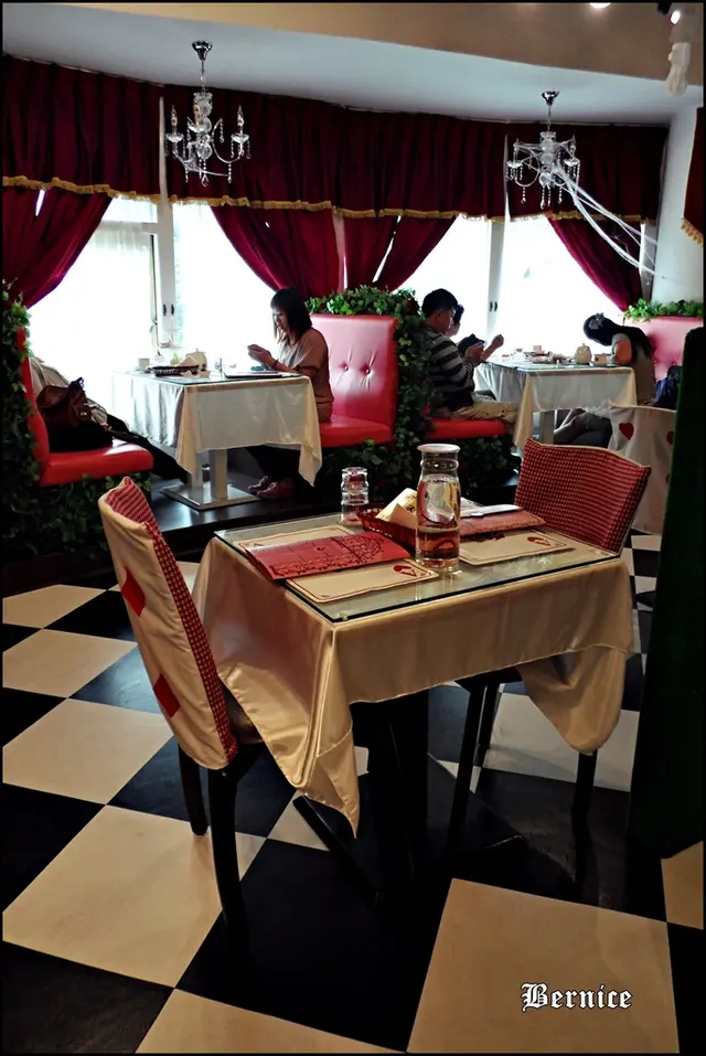 黑白相間的格菱地板和紅色布幔到處充滿著童話色彩