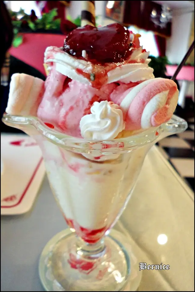 一坨草莓醬旁邊擺著幾顆棉花糖,有點甜膩的冰淇淋下擺放著些許麥片