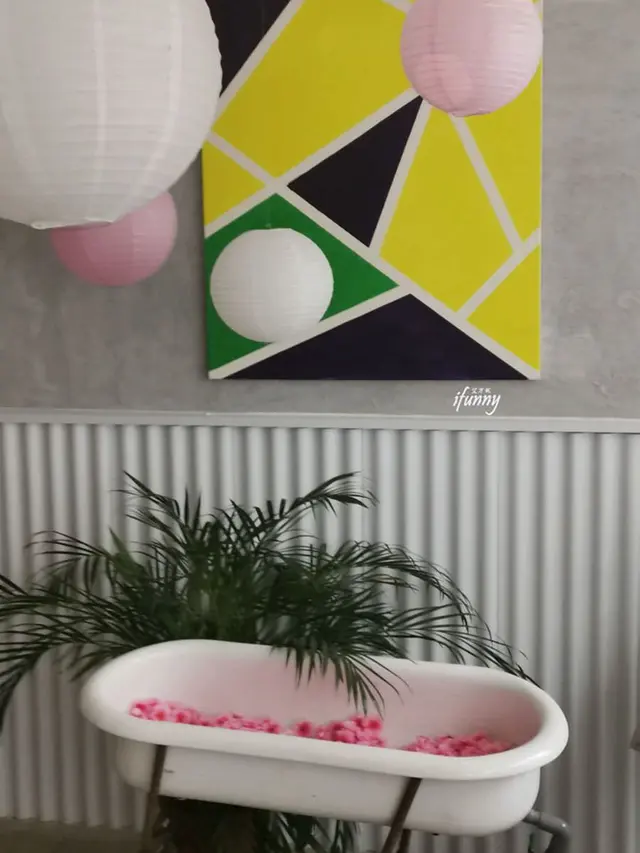 粉紅搭白色紙燈籠,不禁令人聯想到湯圓XDD,但搭配幾何圖型的畫作還有裝滿桃花瓣的小型浴函缸,也有一些後現代風格。