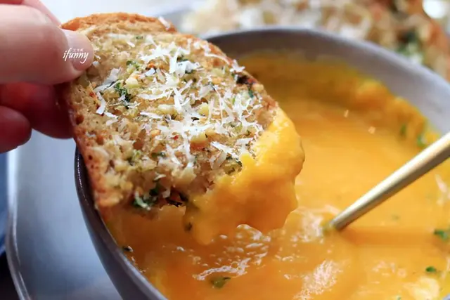 南瓜湯相當地濃郁,雖因拍照放了一下才喝,但濃稠的湯汁依舊保留了溫度,喝來滿滿香濃的南瓜味。附上的烤蒜麵包,是利用酸麵包塗滿特製香料蒜醬,並刨上了起司絲,單吃時香氣十足且具嚼勁,沾著南瓜湯吃更是別具風味。
