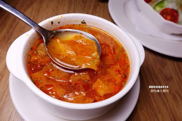 當天提供的湯品為番茄蔬菜湯,蔬菜燉煮的軟爛,酸酸的口感喝起來順口,大人很喜歡這樣的風味,小捧油們倒是覺得偏酸~
